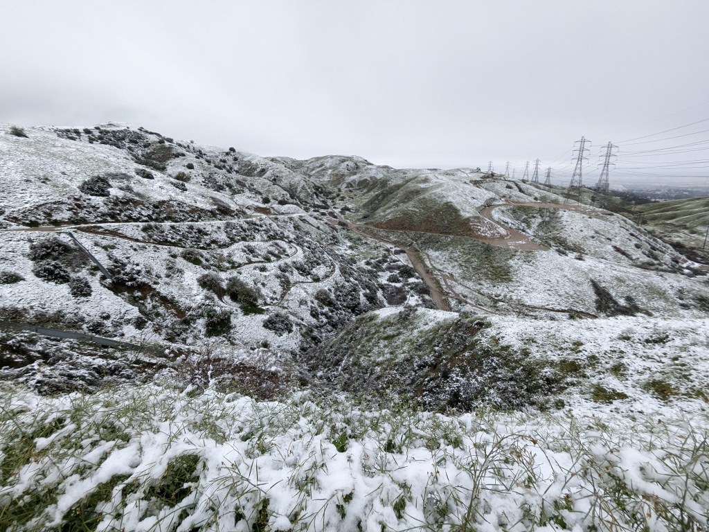 One of my favorite quick getaways into nature in the IE is to hike the South Hills Preserve in Loma Linda. There are countless miles of trails through beautiful rolling hills dotted with chaparral and other scrub. It’s not uncommon to run into coyotes, roadrunners, rattlesnakes, or even wild donkeys. On a typical weekend day, there can be dozens of people enjoying the hills – mountain biking, walking dogs, or taking casual strolls. One cool thing about going there in a snowstorm is having the whole place to yourself (Well, almost to myself. I ended up running into one other person on a bike halfway through my adventure).